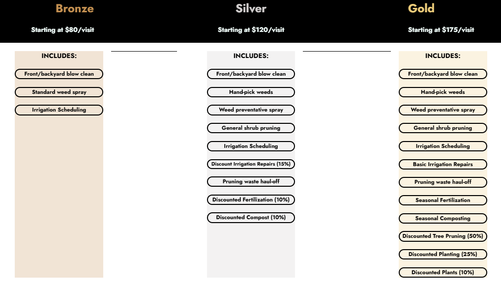 Garden Social offers customizable plans suited to your unique needs and budget, ranging from general maintenance and HOA compliance to advanced care services, we have you covered! View our plans and standard pricing below.